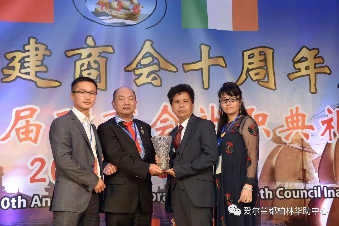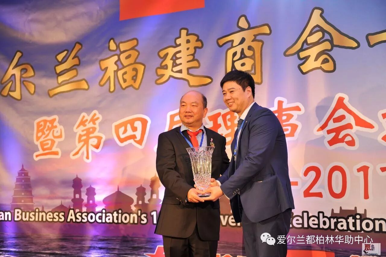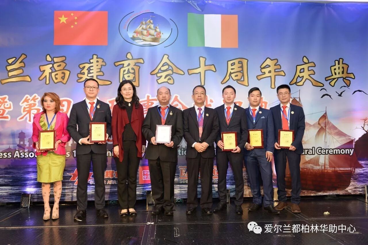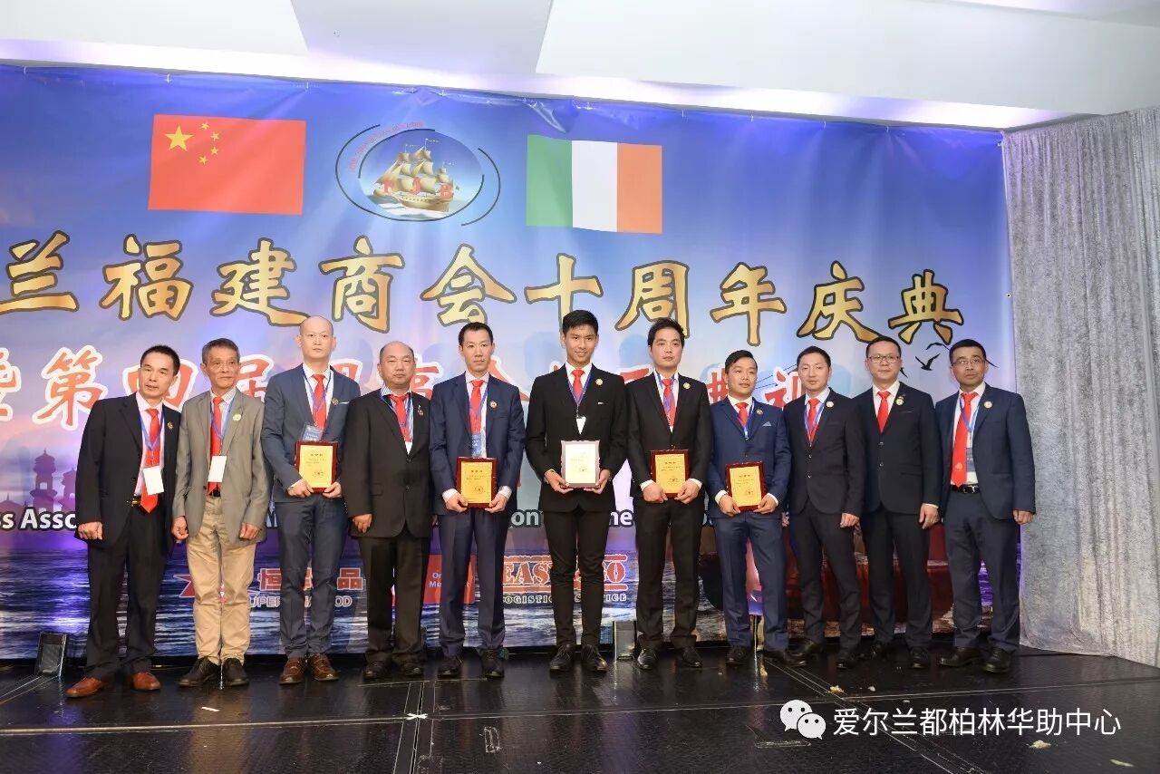 2017年9月26日晚,爱尔兰福建商会成立十周年庆典暨第四届理事会换届就职典礼在都柏林Clontarf Castle Hotel隆重举行,嘉宾政商云集,欢聚一堂。中国驻爱尔兰使馆岳晓勇大使、政务参赞杨华、商务参赞薛河女士、福建省侨联翁小杰副主席、爱尔兰前部长Conor Lenihan, Michael Finnerran、爱尔兰都柏林商会Bredan Foster作为主宾出席本次庆典,肯定了爱尔兰福建商会在服务侨民,推动中爱两国政治、经济、贸易、文化交流,推动国家发展和社会侨团和谐等诸多方面做出的贡献。